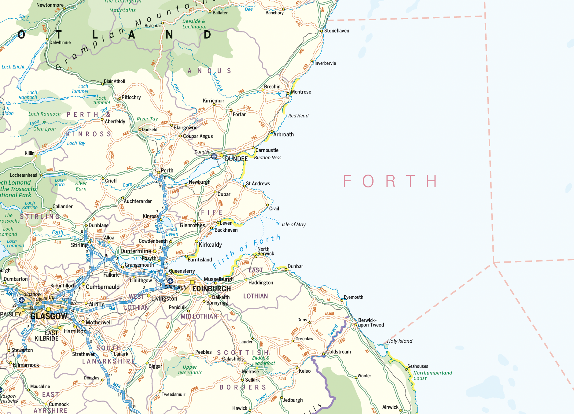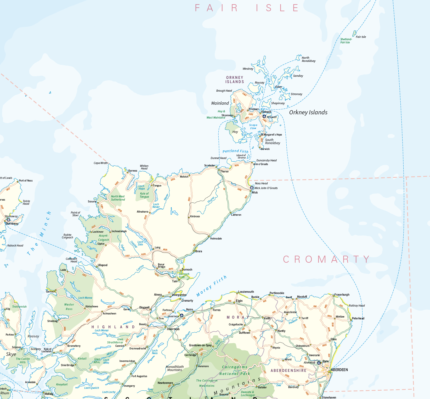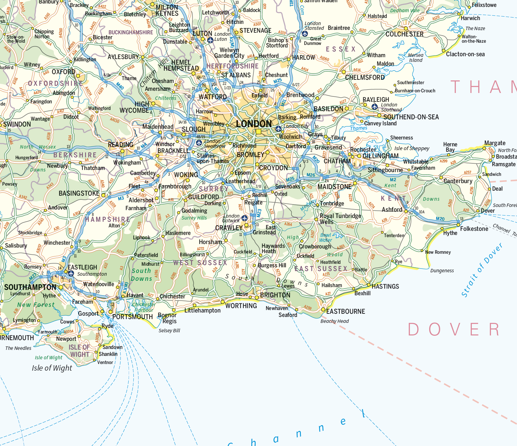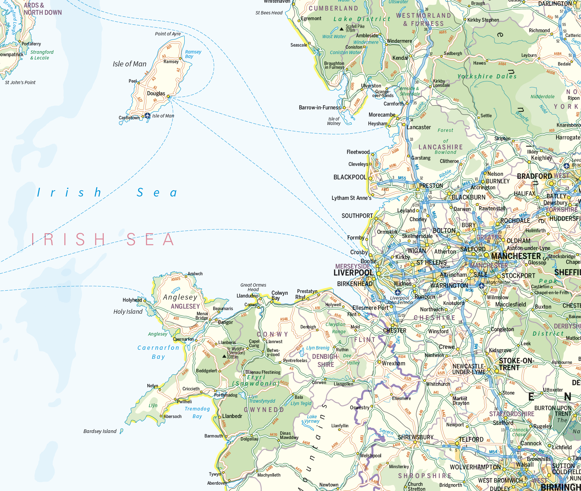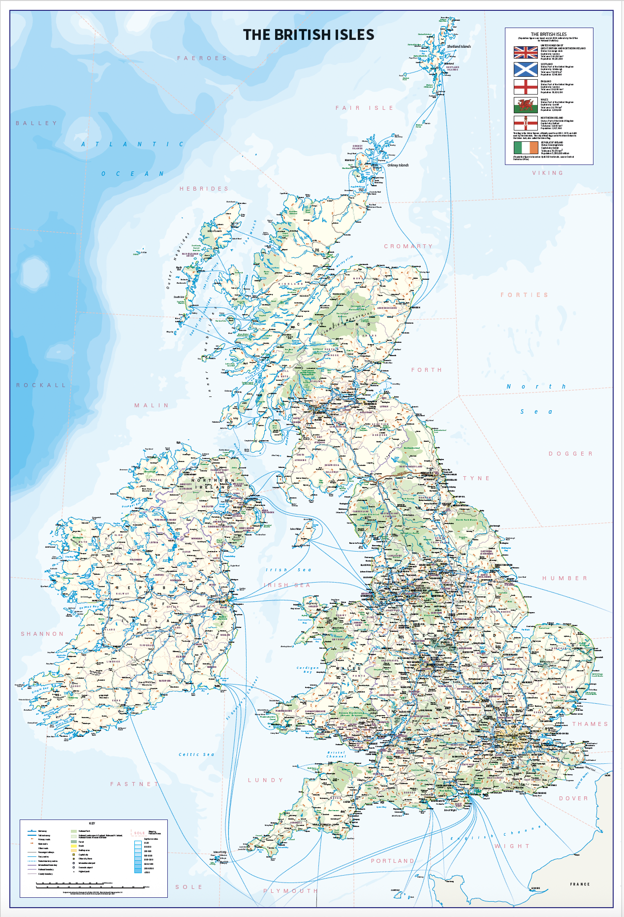An informative and attractive map of the British Isles showing main roads, railways, ferries , counties, towns and cities by population, National Parks beaches and Areas of Outstanding Natural Beauty. Also includes the Shipping Forecast Areas and country stats and flags. Ideal for the office or home. Designed to be fully inclusive and designed to work for everyone, including those with colour vision deficiency (CVD).