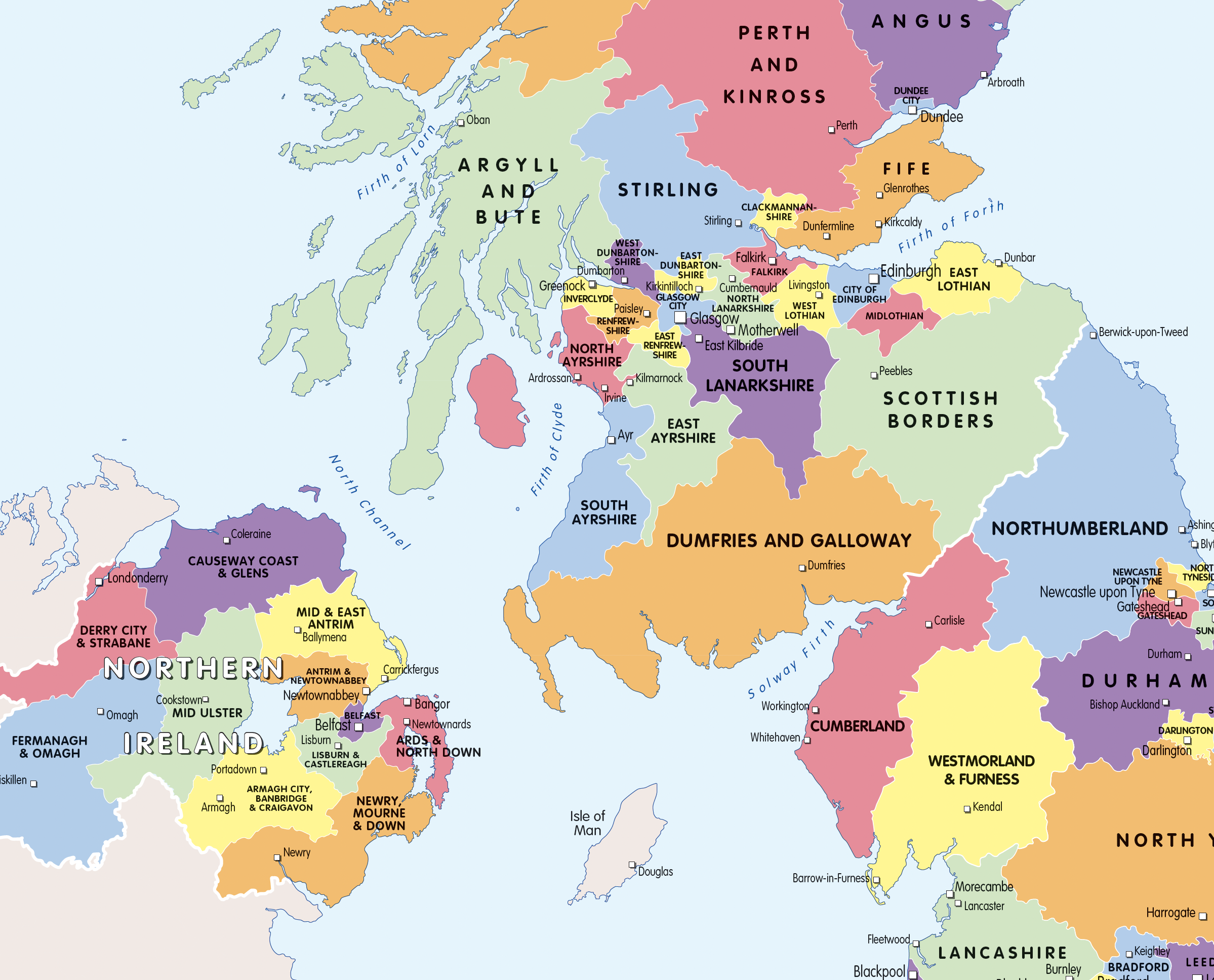 A colourful, easy to read map showing the counties in the UK. Ideal for the home, office or school classroom. Useful information panel including country sizes, populations, and flags.