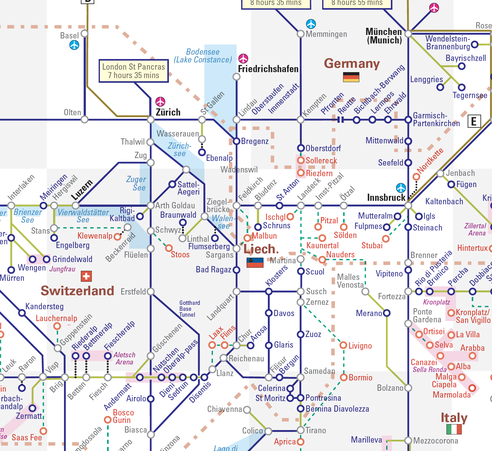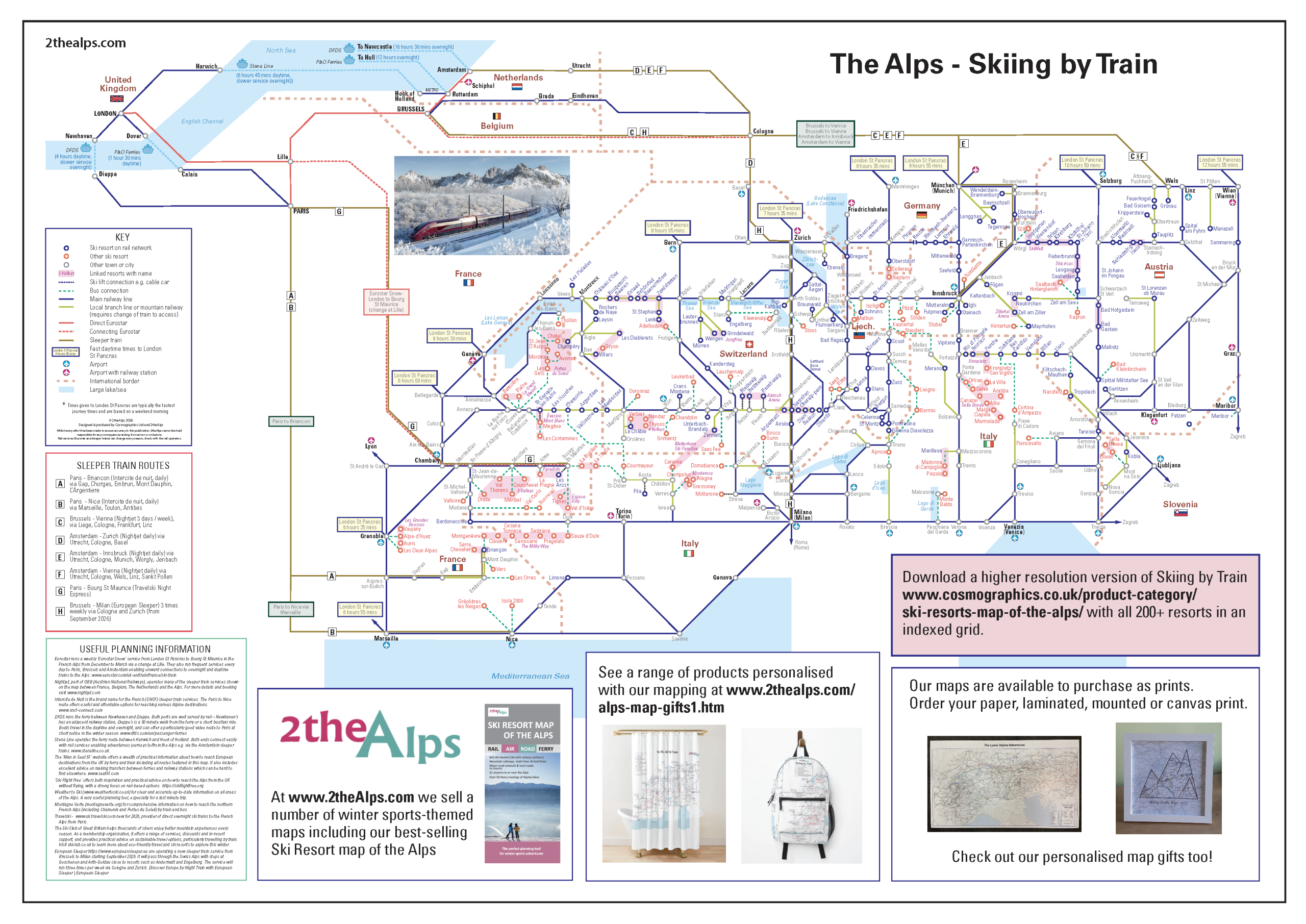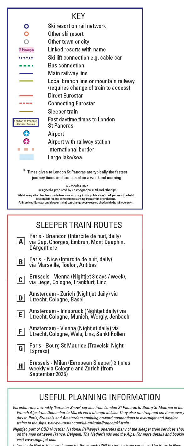 The map includes rail links to the Alps from the UK and surrounding countries and also includes ferries. The rail network is shown in detail in the Alps, with main and local branch lines and ski lift and bus connections to resorts. The map identifies ski resorts on the rail network. Routes to the Alps include the latest sleeper train routes. A panel of other useful information is a useful planning tool.